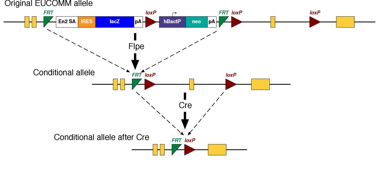 The EUCOMM conditional alleles typically have a Frt-flanked cassette (a "Frt-ed" cassette). The cassette has a splice acceptor which diverts virtually all splicing into the cassette, making the allele a loss-of-function mutation in this configuration. To generate the conditional allele, the Frt-flanked cassette needs to be removed by crossing to Flpe-expressing mice. The Flpe/Frt system is comparable but distinct from the Cre/LoxP system.